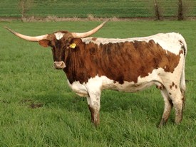 Beautifully long and perfectly twisted horns on this great looking Brindle with white cow.